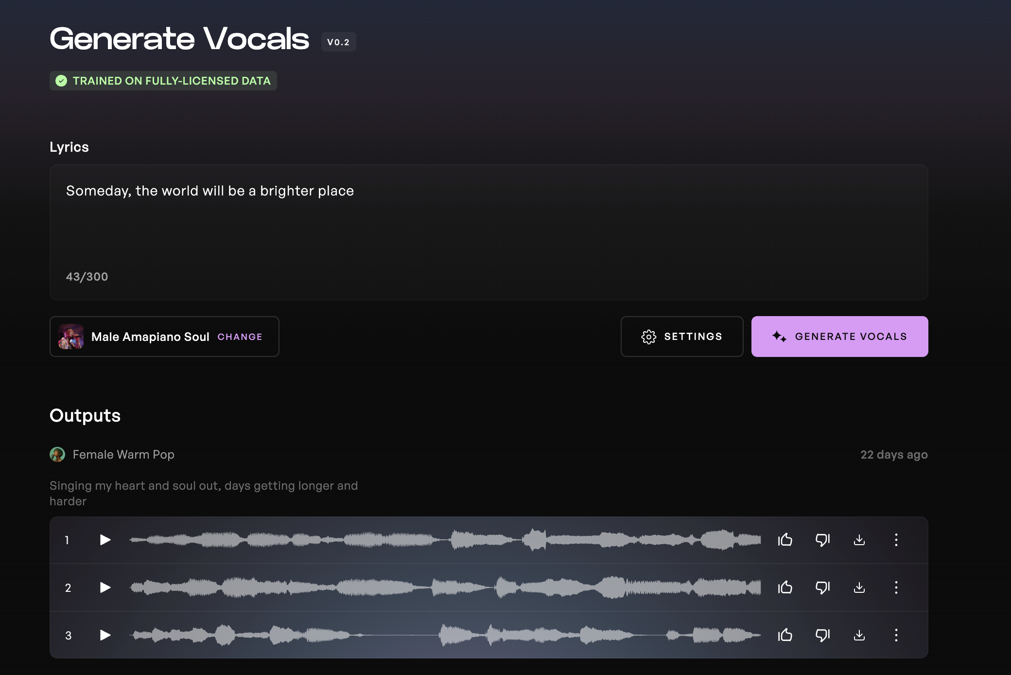 The Vocal Generator on Kits AI is a singing audio generator trained from ethically sourced licensed training data designed to take any lyric input and create dynamic, unique vocals.